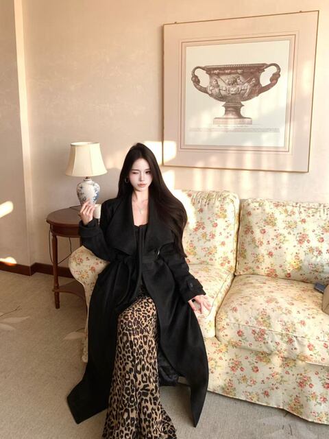 冬にぴったりの、大きなラペルがエレガントなブラックの長袖トレンチコートは、シックでありながらも温かさを保つミドル丈のデザインが特徴です!ゆったりとしたシルエットは、重ね着にも対応できるため、様々なスタイルを楽しむことができます。膝上丈で、足長効果も期待できるため、さりげなく女性らしいラインを演出します。カジュアルな日常使いから、お出かけの際まで幅広く活躍してくれるアイテムです。
